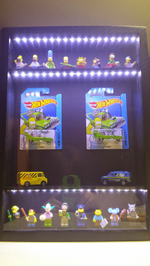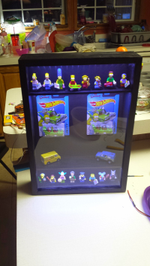After looking around for a shadow box deep enough to hold our simpsons lego minifigures and simpsons hot wheels cars I had to make my own. Most shadow boxes are not deep enough to handle the cars and some of the minifigures. The build is very simple in that its pine and for the joints I simply used butt joints with wood glue and screws. The bottom most board is not glued so you can remove it and then slide out the lexan to load the shadowbox. The back of it is simply thick matting board from hobby lobby stapled to the back and cut to size. Flexible LED strips off ebay are used to provide light for each shelf of the display. I hot glued in a couple of sections of juice box straw into the corners and painted it black to run the LED wiring threw. This helps to keep every thing clean and neat. The shelves are pine as well and simply glued into place as there not supporting much weight. The only thing left to do now is finish the wiring, put some mounting hardware on and hang it.